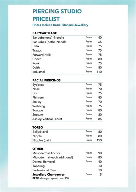 1st lobes 2nd lobes 3rd lobes cartilage piercing 50 ea helix nose piercing 60 ea tongue piercing 65 ea eyebrow piercing 60 ea anti eyebrow piercing 60 ea tragus piercing 60 ea rook piercing 75 ea belly piercing 60 ea conch piercing 65 ea