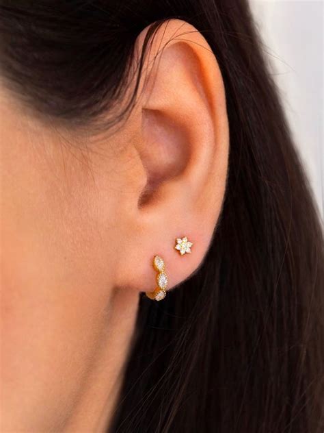 What is double ear piercing? Two piercings are placed adjacent to each other on the lower part of the earlobe at the same time during a double ear piercing. For their second piercing, most women prefer to wear either little stud earrings or very small hoops. If you wear two stud styles on the same hole, the closer the hole, the smaller the stud size. A fun way to wear mismatched earrings on each side is to pair one stud with one drop