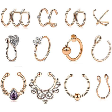 Hay personas a quienes les encantan los septums pero no quieren pasar por el proceso de cicatrización, o bien tienen el septum un poco desviado y no pueden perforárselo. En esos casos, los aros para septum falsos son la solución perfecta. En encontrarás una amplia selección de diseños en distintos materiales como:Expositor de falsos aros de nariz de plata con 8 modelos diferentes de motivos y cristales zirconita en dos tamaños (8 o 10 mm).