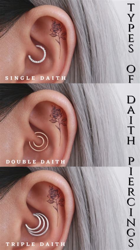 A daith piercing, pronounced “doth, ” is on the smallest fold of cartilage in your ear right where the outer ridge of your ear meets your inner ear above the ear canal. This small area of cartilage can sometimes be challenging to pierce given the awkward location. But this piercing remains popular because of its unique silhouette – a hoop in a daith piercing is just so beautiful.