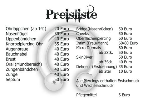 Die Piercing Preise beinhalten meist das Stechen und den Erstschmuck, wobei die Pflegemittel für das Piercing in vielen Studios separat erworben werden müssen. Die individuellen Preise für das Stechen eines Piercings sind abhängig von der Körperstelle und vom Fachwissen des Piercers.