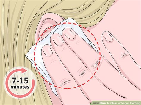 To clean a piercing in your tragus, which is the small piece of cartilage over the ear canal, start by purchasing 1 gallon of distilled water and natural sea salts. Dissolve 4 teaspoons of sea salt in the gallon of water, then fill a mug ¾ full of the solution and heat it in the microwave for 20 to 30 seconds. After the water is warm, carefully lean your head sideways over the mug until your piercing is fully immersed in the saline solution. After 7 to 15 minutes, rinse you ear off with tap water to avoid drying out your skin. Plan to continue cleaning your piercing like this twice a day for 6 to 8 weeks, or until it is fully healed. To learn how to use a compress to clean your tragus piercing, keep reading!