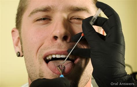 The piercer will check the underside of the tongue for large blood vessels, sometimes with a bright light, and mark a safe placemt for the piercing. The tongue is th clamped with forceps and pierced with a needle, usually from top to bottom with a piercing needle or from bottom to top with a cannula needle. Initial jewelry should always be considerably longer than will ultimately be required to allow for the swelling, which is common following the piercing. Within two days of getting the piercing the tongue can swell up to double its original size. This can lead to pain wh speaking and eating, but this is not permant.
